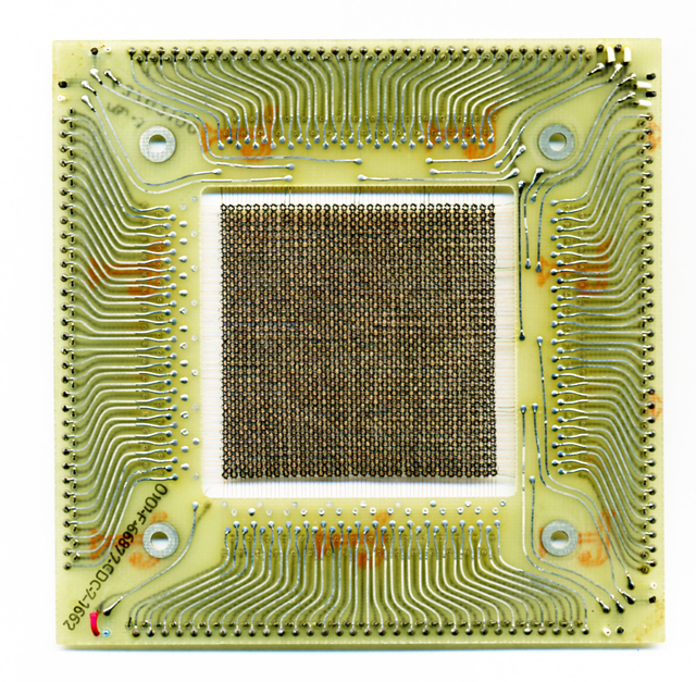 CDC6600 (1964) 用と思われるコアメモリ・プレーン。 64 x 64 = 4096bits。 一辺 10.5cm。コアを貫く縦横の配線は 0.7mm 間隔。